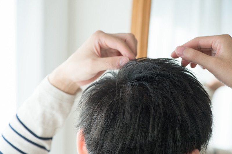 男性型脱毛症は一般に頭頂部、額の生え際、もしくは両方から毛が抜け始め、早いと20歳代から始まります。この脱毛において男性ホルモンは重要な役割を果たしています。 男性ホルモンであるテストステロンが代謝されてジヒドロテストステロンとなり、この作用により髪の毛の発育を抑制し、毛が伸びる成長期を短く休止期を長くします。そして毛が軟らかく細くなり、産毛のみとなって最終的には毛が生えなくなります。後頭部と側頭部の毛包には男性ホルモンが影響しにくいので最後まで毛が残ります。男性型脱毛症は遺伝性が指摘されており、両親や祖父などに薄毛の人がいる場合は脱毛の可能性があります。